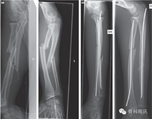 另一個爭議是,盡管單皮質螺釘的穩定性不好已是普遍共識,但最近發表的文獻表明單皮質螺釘治療具有的良好預後。最近,有建議指出ESIN有利於青少年,隻要前臂骨骼的生長還未閉合。在手術治療骨折中固定的類型和持續時間還未達成共識。關於小兒前臂骨幹骨折後移除植入物還沒有足夠的證據。