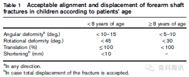 表1 可接受的對位和前臂骨幹骨折的移位取決於患兒的年齡。
