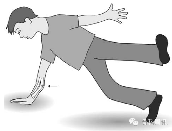 圖1 小兒前臂骨幹骨折最典型的損傷機製是:兒童在摔倒時為保護自己伸展上肢並旋前。在碰撞的時候,前臂旋前會承受創傷能量(箭頭)並突然骨折至旋後位,導致背側彎曲。