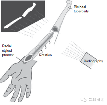 圖2 通過X光片識別骨折部位的皮質不匹配,可用於評估前臂骨幹骨折的旋轉畸形:光滑的骨輪廓出現了“楔形物”,二頭肌結節的方向改變,與橈骨莖突互為180°。該圖首次發表於Acta係列,經出版商(芬蘭奧盧大學)許可轉載。