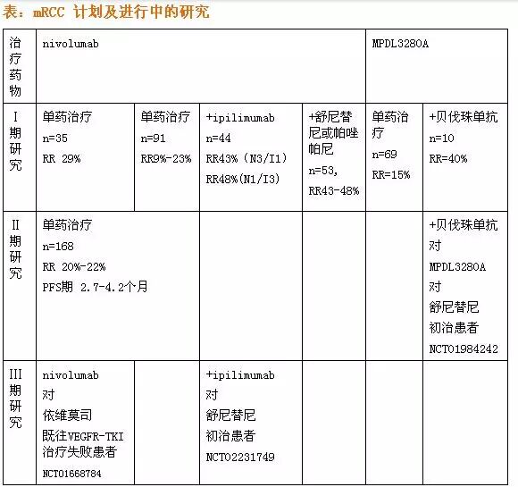 Nivolumab(PD-1的IgG4單克隆抗體)的I期臨床研究首次報告了抗PD-1抗體在mRCC中的療效。34例既往經過多線治療的mRCC患者接受nivolumab治療,客觀有效率可達29%,中位PFS為7.3個月。