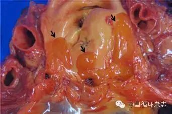 術後行屍體解剖示左心室發現嚴重的心肌梗死伴再灌注損傷,剩餘腱索增厚伴融合。主動脈根部發現主動脈瓣上方出現明顯增厚的地圖樣病變(圖2、3)。顯微鏡下檢查發現左心房心內膜和增厚的主動脈內膜出現彌漫性的纖維化改變。