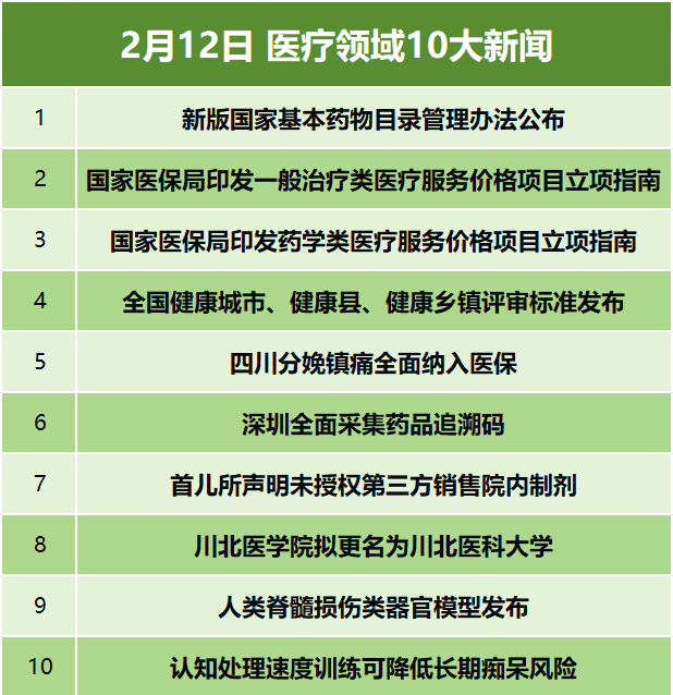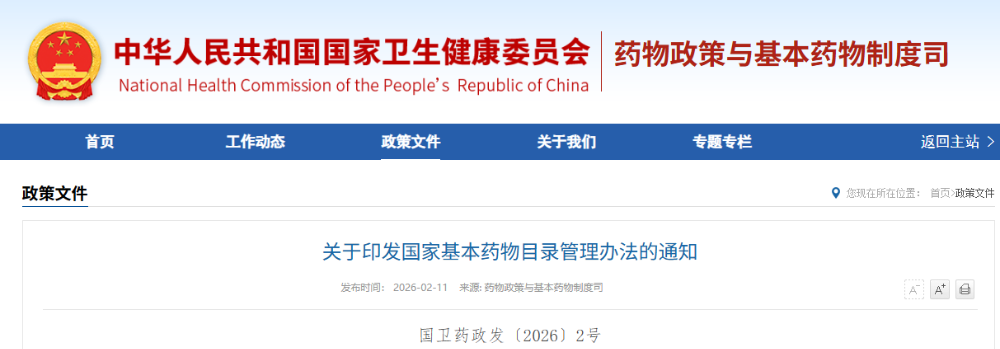 2月11日,國家衛生健康委員會等11部門聯合印發《國家基本藥物目錄管理辦法》,從六方麵完善製度設計,明確目錄調整周期不超3年,突出臨床價值、堅持中西醫並重,優化目錄結構並強化監測評價,推動與分級診療、藥品集采等政策銜接,進一步健全基本藥物遴選管理機製。(來源:國家衛生健康委)