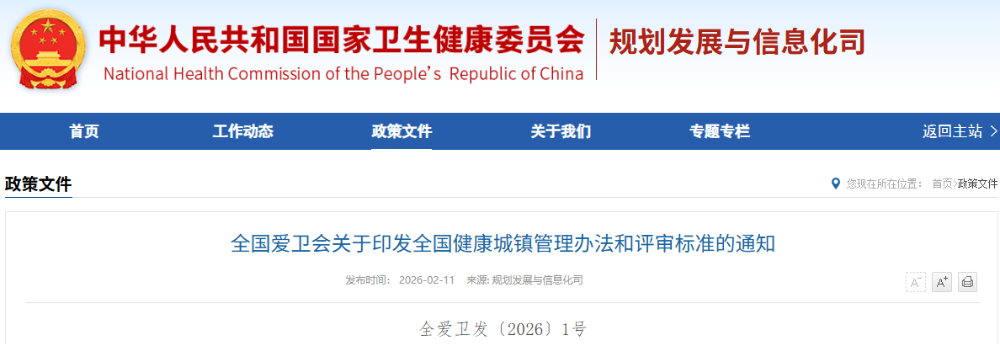 2月11日,全國愛國衛生運動委員會印發通知,正式發布《全國健康城鎮管理辦法》及3項評審標準,部署全國健康城鎮創建工作。通知明確評審每3年一個周期,嚴禁“運動式”創建,要求建立常態化管理機製,推動創建評審基層無感、成效群眾可感,助力2035年建成健康中國目標實現。(來源:國家衛生健康委)