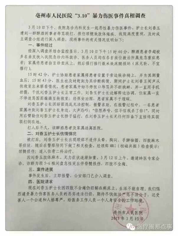 3月10日下午,我院急診內科發生一起惡性暴力傷醫事件,護士長劉香玉遭到一群醉酒鬧事者辱罵毆打,損傷頸髓致肢體癱瘓。我院高度重視,及時成立調查小組進行深入調查。現將事件的有關情況說明如下: