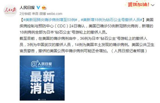 美國疾病控製與預防中心(CDC)24日確認,美國已確診53例新冠肺炎病例,新增的18例病例全部為日本“鑽石公主”號遊輪上的撤僑人員。