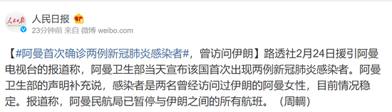 路透社2月24日援引阿曼電視台的報道稱,阿曼衛生部當天宣布該國首次出現兩例新冠肺炎感染者。阿曼衛生部的聲明補充說,感染者是兩名曾經訪問過伊朗的阿曼女性,目前情況穩定。報道稱,阿曼民航局已暫停與伊朗之間的所有航班。(周輖)